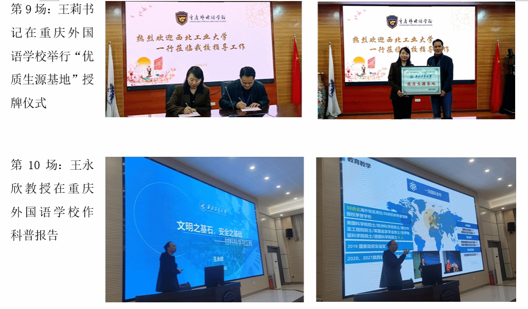 为构建大学与中学之间的教育合作,打造教育合作共同体,充分发挥优质生源基地作用,持续提升体彩超级大乐透 声誉,2024年2月29日至3月5日,由体彩超级大乐透 党委书记王莉、院长助理刘晓刚、重庆招生组组长林伟及西北工业大学伦敦玛丽女王大学工程体彩超级大乐透 王永欣教授、航空体彩超级大乐透 李华星教授、航空体彩超级大乐透 杨华保教授等组成的联合招生宣传组先后赴重庆市巴川国际高级中体彩超级大乐透 、铜梁中体彩超级大乐透 、凤鸣山中学、首佳教育、蕴华教育、重庆外国语体彩超级大乐透 等6所中学与教育机构举行招生宣传活动计11场,包括4场科普报告、6场招生宣讲、1场“优质生源基地”授牌活动。
